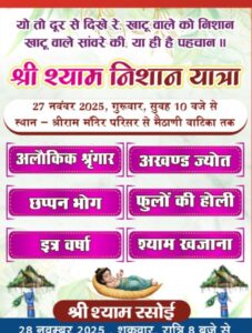 27 नवंबर को बाबा श्याम की भव्य निशान यात्रा श्री राम मंदिर से पूरे उत्साह, ढोल बाजों के साथ सैकड़ों श्याम प्रेमियों के द्वारा निकली जाएगी,जो मुख्य चौक,रेस्ट हाउस चौक,सनशाइन स्कूल मार्ग से होते हुए मैठाणी वाटिका तक जाएगी,