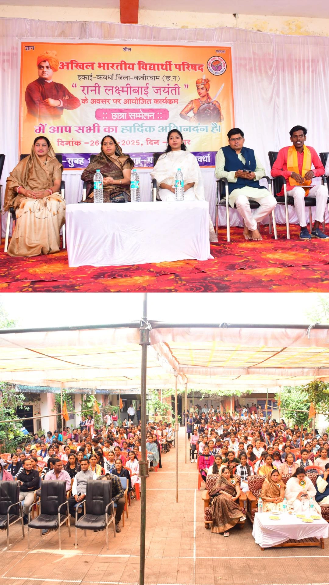कवर्धा/अखिल भारतीय विद्यार्थी परिषद (एबीवीपी)द्वारा आज महारानी लक्ष्मीबाई की जयंती अवसर पर एक भव्य छात्रा सम्मेलन, का आयोजन गर्ल्स कालेज में किया गया। इस कार्यक्रम में क्षेत्र की दर्जनों शिक्षण संस्थाओं से आई छात्राओं ने उत्साहपूर्वक सांस्कृतिक कार्यक्रम में भाग लिया।