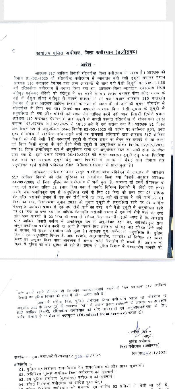 कबीरधाम पुलिस अधीक्षक धर्मेन्द्र सिंह (IPS) के कठोर अनुशासनात्मक निर्देशों के तहत पुलिस विभाग में व्याप्त अनुशासनहीनता, कर्तव्यच्युति और शराब सेवन जैसी गंभीर प्रवृत्तियों पर कठोरतम कार्रवाई की गई है। विभागीय जांच में यह स्पष्ट पाया गया कि तीनों आरक्षकों का आचरण पुलिस विभाग की गरिमा, अनुशासन और जनता के प्रति जवाबदेही के पूर्णतः विपरीत था।