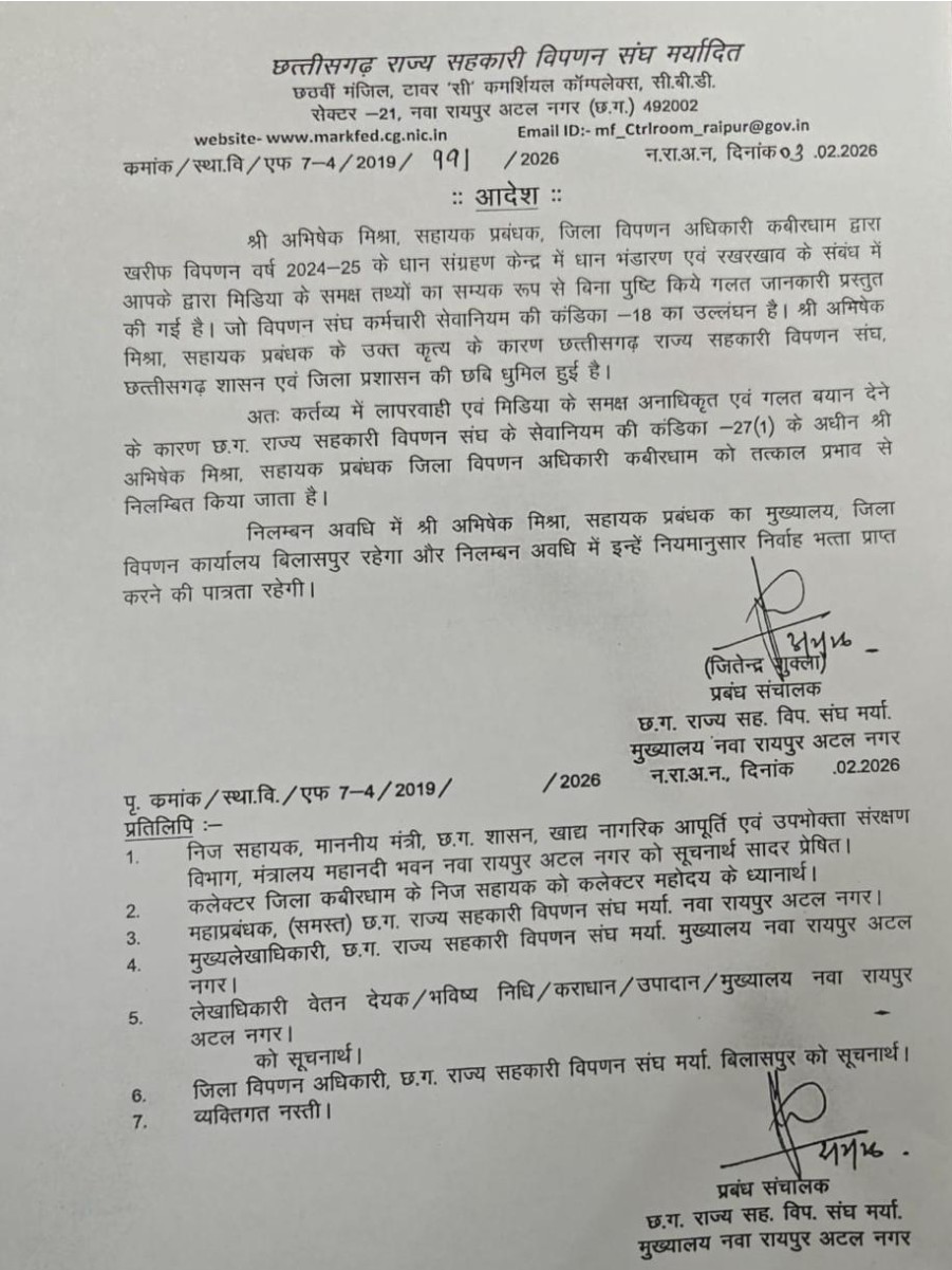 कवर्धा में करीब 7 करोड़ रुपये के धान शॉर्टेज केस में विवादित बयान देने वाले जिला विपणन अधिकारी (डीएमओ) अभिषेक मिश्रा को तत्काल प्रभाव से निलंबित कर दिया गया है। यह कार्रवाई 3 फरवरी 2026 को प्रबंध संचालक, राज्य स्तर रायपुर द्वारा मीडिया में भ्रामक और गैर-जिम्मेदाराना जानकारी देने के आरोप में की गई है। आदेश की कॉपी बुधवार को जारी हुई, जिसके बाद जिला प्रशासन में हड़कंप मच गया है।