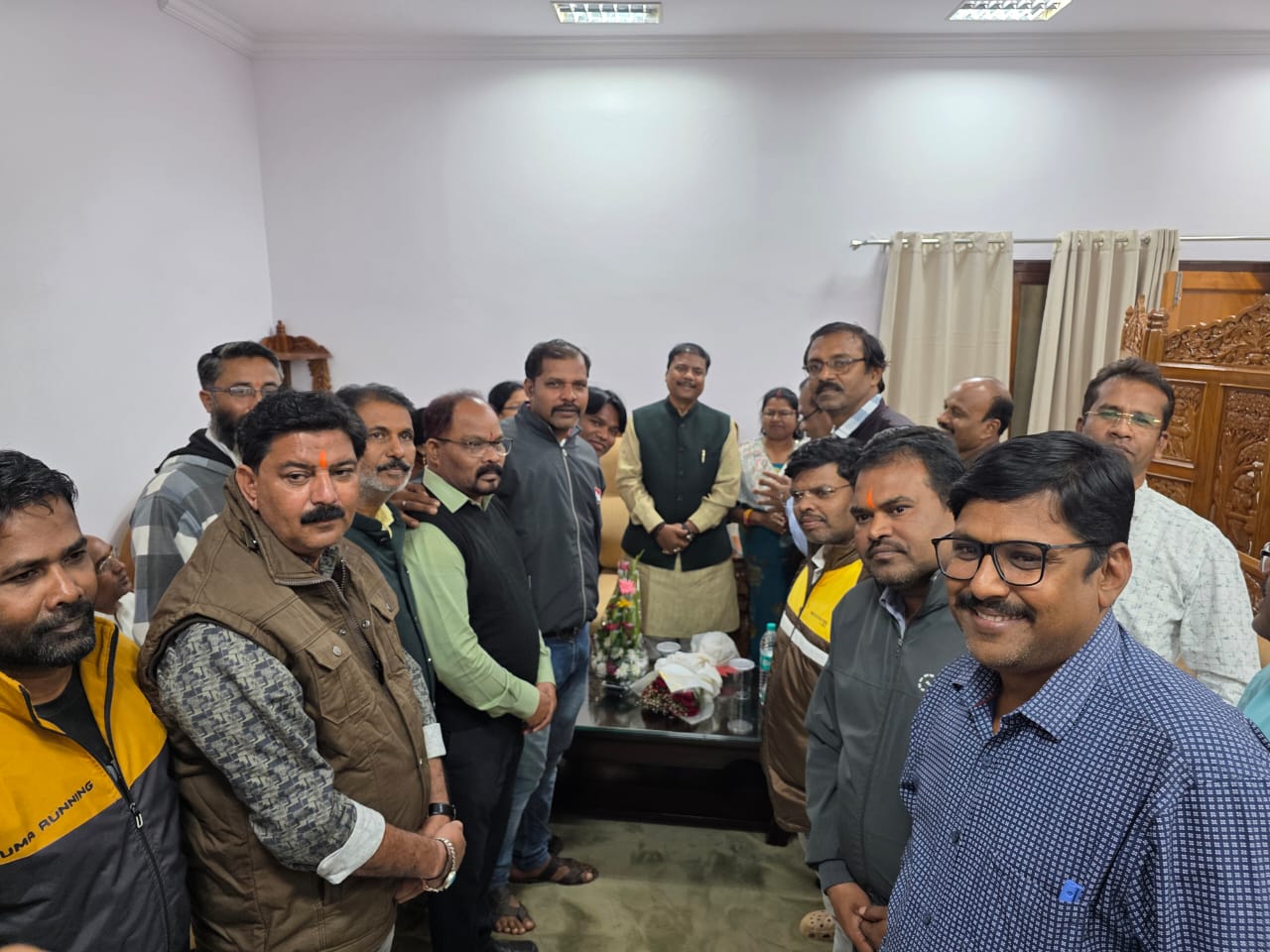 राज्य शासन ने दिनांक 4.11.2025 को संयुक्त संचालक शिक्षा राकेश पांडे को हटाकर उनके स्थान पर एचआर सोम की पदस्थापना कर दी गई ।जिससे उत्साहित शिक्षकों ने सर्व शैक्षिक संगठन के नेतृत्व में मंत्री केदार कश्यप से भेंट कर आभार व्यक्त करते हुए धन्यवाद ज्ञापित किया। चर्चा के दौरान शिक्षक संगठनों के पदाधिकारी ने मंत्री को यह भी अवगत कराया कि अभी भी पूर्व संयुक्त संचालक के द्वारा शिक्षक संगठनों को अघोषित रूप से धमकी दी जा रही है। मंत्री श्री केदार कश्यप ने विनम्रतापूर्वक सभी का आभार ग्रहण कर धन्यवाद दिया।
