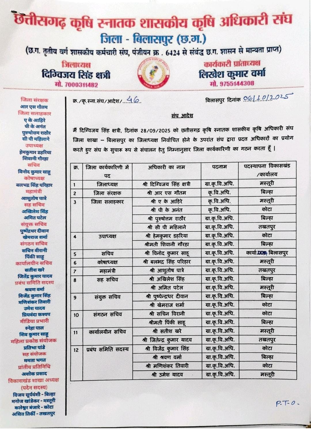 CG – छत्तीसगढ़ कृषि स्नातक शासकीय कृषि अधिकारी संघ बिलासपुर के जिला कार्यकारिणी की घोषणा जानें किसको कहाँ मिली जिम्मेदारी पढ़े पूरी ख़बर