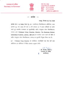 छत्तीसगढ़ विश्वविद्यालय अधिनियम, 1973 (क्रमांक 22, सन् 1973) की धारा 13 की उपधारा (1) में प्रदत्त शक्तियों का प्रयोग करते हुए माननीय राज्यपाल एवं कुलाधिपति, शहीद नंदकुमार पटेल विश्वविद्यालय, रायगढ़ द्वारा Professor Vinay Chauhan, Director, The Business School, University of Jammu, Jammu, J&K (UT) को कार्यभार ग्रहण करने की तिथि से शहीद नंदकुमार पटेल विश्वविद्यालय, रायगढ़ का कुलपति नियुक्त किया गया है। Professor Vinay Chauhan का कार्यकाल, उपलब्धियाँ तथा सेवा शर्ते उक्त अधिनियम एवं परिनियम में निहित प्रावधान अनुसार होगी।