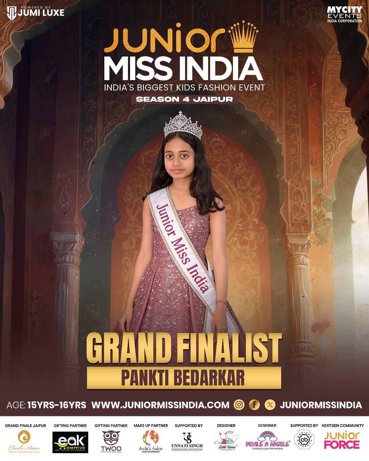 ये सौन्दर्य प्रतियोगिता 5 से 16 साल के बच्चों का सबसे बड़ा प्लेटफार्म है जिसका ग्रैंड फिनाले गुलाबी शहर राजस्थान जयपुर मे जनवरी 6 से 9 तारीख तक होने जा रही है जिसमें बॉलीवुड स्टार, नामी ब्रांड, फैशन इंडस्ट्री की नामी हस्तियों के बिच बस्तर की चमकती सितारा एक बार फिर पुरे जोश और आत्मविश्वास के साथ छत्तीसगढ़ का परचम लहराने को तैयार है।