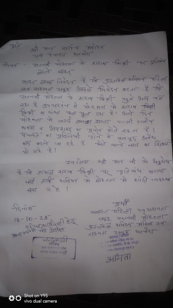 मस्तूरी//पचपेड़ी थाना क्षेत्र के ग्राम पंचायत भटचौरा में इन दिनों उप सरपंच पर महिला समितियों ने गांव में असामाजिक तत्वों को बढ़ावा देने और अवैध रूप से शराब बेचने का आरोप लगाते हुए पचपेड़ी थाने में लिखित शिकायत दर्ज कराई हैँ गाँव की महिला सरपंच और स्व. सहायता समूह की महिलाओं ने लिखित शिकायत में बताया है कि भटचौरा सतनामी मोहल्ले में खुले आम अवैध रूप से शराब बेचा जा रहा है जिनको उप सरपंच का संरक्षण मिला हुआ है लोग अवैध रूप से बिकने वाले शराब से परेशान हैं और शराबी रास्ते भर गांव में अब शब्दों का लगातार प्रयोग कर रहे हैं जिसके कारण लड़ाई झगड़ा भी हो रहा है और गांव का माहौल भी लगातार खराब हो रहा है अवैध शराब बिकना ज़ब से शुरू हुआ हैँ उसके बाद से पढ़ने लिखने वाले बच्चे भी नशे की आदी हो रहे हैं महिलाओं ने उपसरपंच पर आरोप लगाते हुए बताया है कि पंचायत के जन प्रतिनिधि होने के बाद भी उपसरपंच धड़ल्ले से अवैध शराब बेचने वालों को संरक्षण दे रहा हैं जिन पर उचित कार्रवाई करने और गाँव कों इस बड़ी समस्या से निकलवाने में मदद करने आग्रह किया गया हैँ।