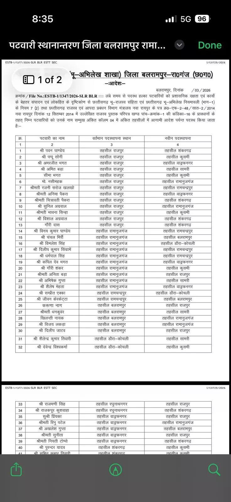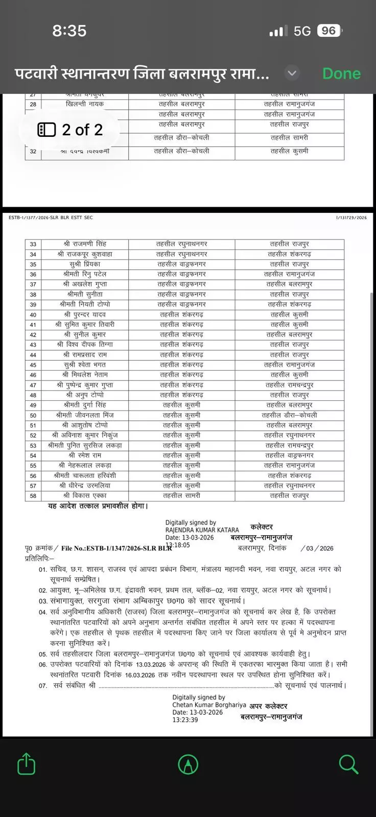 बलरामपुर।जिले में प्रशासनिक व्यवस्था को मजबूत करने और राजस्व विभाग में पारदर्शिता सुनिश्चित करने के उद्देश्य से जिला प्रशासन ने बड़ा कदम उठाते हुए एक साथ 58 पटवारियों का तबादला कर दिया है। कलेक्टर राजेंद्र कुमार कटारा के हस्ताक्षर से जारी आदेश के बाद पूरे जिले के राजस्व अमले में हलचल मच गई है।