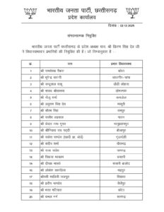 CG ब्रेकिंग : छत्तीसगढ़ में बीजेपी की विधानसभावार प्रभारियों की हुई नियुक्ति, देखें किस नेता को कहां की मिली कमान…..