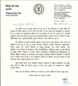 CG- मुख्यमंत्री शिक्षा गुणवत्ता अभियान: सीएम विष्णु देव साय ने जनप्रतिनिधियों और शिक्षाविदों को पत्र लिखकर की सहभागिता की अपील….