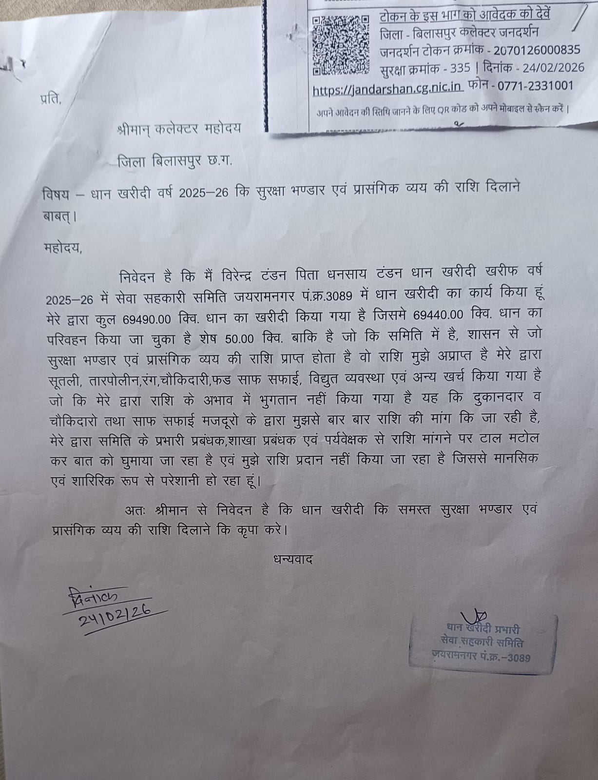 वीरेंद्र टंडन पिता धनसाय टंडन ने कलेक्टर बिलासपुर संजय अग्रवाल को आवेदन देकर बताया कि उन्होंने कुल 69,490.00 क्विंटल धान की खरीदी की और पूरा परिवहन भी हो चुका है। सूतली, तारपोलीन, चौकीदारी, फड़ सफाई आदि पर खुद खर्च की गई राशि शासन से आ चुकी है, लेकिन संस्था प्रबंधक ने भुगतान नहीं किया। जनदर्शन टोकन क्रमांक 2070126000835, सुरक्षा क्रमांक 335 जारी हुआ।
