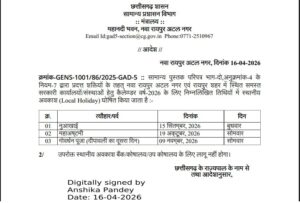 रायपुर। छत्तीसगढ़ सामान्य प्रशासन विभाग ने तीन स्थानीय अवकाश की घोषणा की है। यह अवकाश रायपुर अटल नगर व रायपुर शहर में स्थित सभी सरकारी कार्यालयों, शासकीय संस्थानों और सरकारी कर्मचारियों को लिए होगा। सामान्य प्रशासन विभाग की उप सचिव अंशिका ऋषि पाण्डेय ने आदेश जारी किया है।