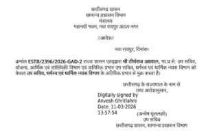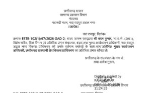 रायपुर। छत्तीसगढ़ सरकार ने प्रशासनिक स्तर पर आंशिक फेरबदल करते हुए दो अधिकारियों के प्रभार में बदलाव किया है। सामान्य प्रशासन विभाग (GAD) द्वारा जारी अलग-अलग आदेशों में यह निर्णय लिया गया।