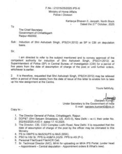 CG IPS News : छत्तीसगढ़ कैडर के इस आईपीएस को मिली बड़ी जिम्मेदारी, डेपुटेशन में भेजे गए सीबीआई, संभालेंगे एसपी का पद, मिनिस्ट्री ऑफ होम अफेयर्स ने जारी किया आदेश…..