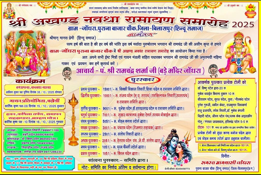 बिलासपुर//मस्तूरी क्षेत्र के ग्राम पंचायत जोंधरा में दिनांक 6 अक्टूबर दिन सोमवार से अखंड नवधा रामायण समारोह का आयोजन प्रारंभ होने जा रहा है जहां 9 दिनों तक चलने वाले इस भव्य आयोजन में आसपास अन्य जिलों से रामायण मंडलीया मर्यादा पुरुषोत्तम भगवान श्री राम की ऐतिहासिक जीवनी सुनाएंगे कहते हैं रामायण में हर समस्या से निकलने का रास्ता दिखाया गया है और इसीलिए आज भी हर घर में रामायण का पाठ किया जाता है और जगह-जगह नवधा रामायण का आयोजन भी किया जाता है ताकि लोग भगवान श्री राम के द्वारा बताए गए सत्य के रास्ते पर चलकर न सिर्फ अपनी बल्कि दूसरों के जीवन में भी उजाला से भर दे। बताते चलें की नवधा रामायण का आयोजन 6 अक्टूबर से 14 अक्टूबर तक होगा वही 15 अक्टूबर कों गायन प्रतियोगिता का आयोजन रखा गया हैँ जहां कई भारी और आकर्षक पुरस्कार रखें गए हैँ जो इस प्रकार हैँ…