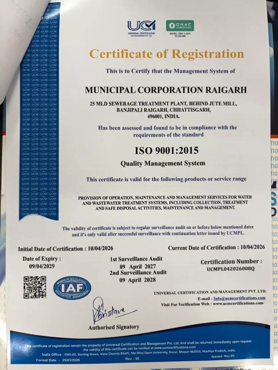 रायगढ़। छत्तीसगढ़ के रायगढ़ नगर निगम के लिए यह गौरव का विषय है कि शहर के 25 एमएलडी एवं 7 एमएलडी सीवरेज ट्रीटमेंट प्लांट (एसटीपी) को अंतरराष्ट्रीय स्तर का ISO 9001:2015 (क्वालिटी मैनेजमेंट सिस्टम) प्रमाण पत्र प्राप्त हुआ है। रायगढ़ नगर निगम के दोनों एसटीपी के नाम प्रदेश का पहला आईएसओ प्रमाणीकरण का ताज सज गया है। यह उपलब्धि नगर निगम आयुक्त बृजेश सिंह क्षत्रिय के कुशल मार्गदर्शन, सतत निगरानी एवं टीम के प्रयासों का परिणाम है।