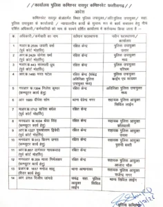 रायपुर। रायपुर कमिश्नरेट में बड़ी संख्या में पुलिसकर्मियों की पदस्थापना की गयी है। वहीं कई पुलिसकर्मियों को रक्षित केंद्र में भेजा गया है।