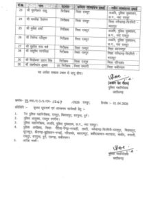 रायपुर। रायपुर पुलिस विभाग में बड़े पैमाने पर फेरबदल किया गया है। बड़ी संख्या में थाना प्रभारियों का तबादला हुआ है। सूची में 29 थाना प्रभारी और 1 उपनिरीक्षक का नाम शामिल है। डीजीपी अरुण देव गौतम ने यह आदेश जारी किया है।