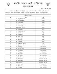 प्रदेश संगठन की तरफ से जारी सूची में 6 उपाध्यक्ष, दो महामंत्री, सात मंत्री समेत कोषाध्यक्ष, सह-कोषाध्यक्ष, कार्यालय मंत्री, प्रचार-प्रसार मंत्री, सोशल मीडिया प्रभारी, प्रदेश प्रवक्ता, आईटी सेल प्रभारी और मन की बात प्रभारियों के नाम तय किये गए है।