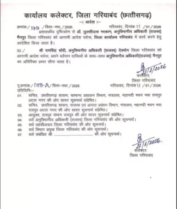 रायपुर। गरियाबंद जिले में अश्लील डांस करने वाली महिलाओं के डांस पर नोट उड़ाने वाले एसडीएम को हटा दिया गया है। जिला कलेक्टर भगवान सिंह उईके ने वायरल वीडियो पर संज्ञान लेते हुये मैनपुर एसडीएम तुलसी दास मरकाम को हटाते हुये शो-काॅज नोटिस भी जारी किया है। साथ ही अपर कलेक्टर के नेतृत्व में एक जांच समिति भी गठित की है, जो इस पूरे मामले की जांच करेगी और रिपोर्ट कमिश्नर को सौंपीगी। नीचे देखें कलेक्टर का आदेश…