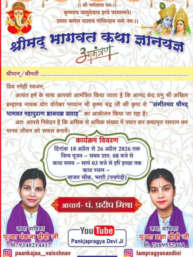 बिलासपुर//मस्तूरी के ग्राम पंचायत भरारी में 18 अप्रैल दिन शनिवार से श्रीमद् भागवत कथा ज्ञान यज्ञ आरम्भ हो रहा हैं जो पुरे ग्राम वासियों की सहयोग से कराया जा रहा है जहाँ कथा वाचिका पंकजा और प्रज्ञा की मधुर वाणी से क्षेत्रवासी श्रीमद् भागवत कथा का रसपान करेंगे।