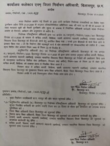 बिलासपुर एसडीएम और निर्वाचन रजिस्ट्रीकरण अधिकारी मनीष साहू के द्वारा कलेक्टर को 15 नवंबर को प्रस्ताव भेजकर कविता बनर्जी शिक्षिका स्वामी आत्मानंद महारानी लक्ष्मीबाई उच्चतर माध्यमिक विद्यालय जिला बिलासपुर को निर्देशों की अवहेलना किए जाने के फल स्वरुप छत्तीसगढ़ सिविल सेवा (वर्गीकरण नियंत्रण तथा अपील) नियम 1966 के नियम 9 के तहत कुमारी कविता बनर्जी के निलंबन का प्रस्ताव भेजा। एसडीएम के प्रस्ताव पर कलेक्टर एवं जिला निर्वाचन अधिकारी संजय अग्रवाल ने कविता बनर्जी शिक्षिका को निलंबित कर दिया है।