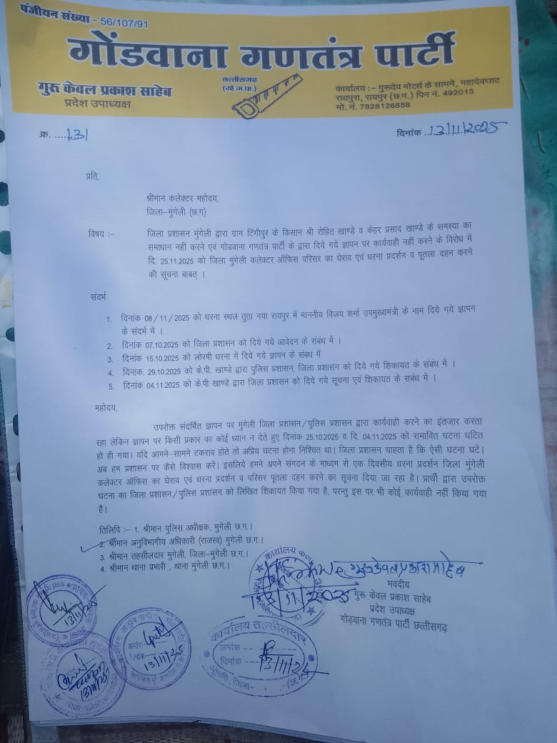 गोंडवाना गणतंत्र पार्टी छत्तीसगढ़ द्वारा मुंगेली जिले में शासन और प्रशासन की लापरवाही के खिलाफ 25 नवंबर 2025 को जिला मुख्यालय पर पुतला दहन एवं बड़ा आंदोलन आयोजित किया जाएगा।