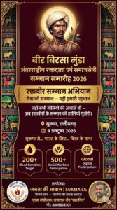 सुकमा। छत्तीसगढ़ के सुकमा जिले में आगामी 9 अक्टूबर 2026 को “बीर बिरसा मुंडा अंतरराष्ट्रीय रक्तदाता एवं समाजसेवी सम्मान समारोह 2026” का आयोजन किया जाएगा। इस समारोह का उद्देश्य देशभर के स्वैच्छिक रक्तदाताओं और समाजसेवियों को सम्मानित करना तथा समाज में सेवा, समर्पण और मानवीय मूल्यों को बढ़ावा देना है।