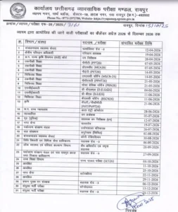 रायपुर। छत्तीसगढ़ व्यावसायिक परीक्षा मंडल ने आयोजित होने वाली परीक्षाओं का कैलेंडर जारी किया है। व्यापमं द्वारा जारी परीक्षाएं अप्रैल से दिसम्बर तक होगी। तकनीकी शिक्षा, क्षेत्रीय परिवहन अधिकारी, कृषि, उच्च न्यायालय, गृह पुलिस, नगर सेना, जल संसधान, नगर सेना, संयुक्त भर्ती परीक्षा समेत विभिन्न परीक्षाओं की तारीख नीचे देखें…