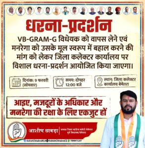 बेमेतरा :बेमेतरा में आगामी 9 फरवरी को जिला कांग्रेस कमेटी द्वारा एक बड़ा प्रदर्शन होने जा रहा हैपूर्व विधायक आशिष छाबड़ा और जिला कांग्रेस कमेटी के अध्यक्ष के नेतृत्व में कांग्रेसी कार्यकर्ता कलेक्ट्रेट कार्यालय का घेराव करेंगे। यह विरोध प्रदर्शन मुख्य रूप से VB GRAM G विधेयक को वापस लेने और मनरेगा (MGNREGA) को उसके पुराने स्वरूप में बहाल करने की मांग को लेकर किया जा रहा है मनरेगा के मूल स्वरूप की बहाली और नए विधेयक का विरोध पूर्व विधायक आशीष छाबड़ा का कहना है कि केंद्र सरकार नए कानूनों के जरिए मनरेगा को खत्म करने की साजिश रच रही है।कांग्रेस का दावा है कि सरकार का यह कदम सीधे तौर पर गरीब मजदूरों के रोजगार और उनकी आजीविका पर प्रहार है