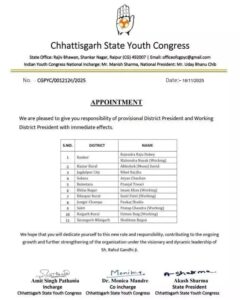 रायपुर। छत्तीसगढ़ यूथ कांग्रेस ने 11 नये जिला अध्यक्षों की नियुक्ति की है। सूची में बस्तर, बिलासपुर, जगदपुर, बेमेतरा, सुकमा, कांकेर, भिलाई, जांजगीर-चांपा, शक्ति, रायगढ़, सारंगढ़-बिलाईगढ़ में नये जिला अध्यक्ष नियुक्त किये गये हैं।