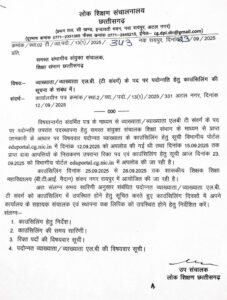 व्याख्याता / व्याख्याता एलबी टी संवर्ग के पद पर पदोन्नति उपरांत पदस्थापना हेतु समस्त संयुक्त संचालक शिक्षा संभाग के माध्यम से प्राप्त जानकारी के आधार पर विषयवार पदोन्नत व्याख्याता के काउंसिलिंग हेतु सूची विभागीय पोर्टल eduportal.cg.nic.in में 12.09.2025 को अपलोड की गई थी।
