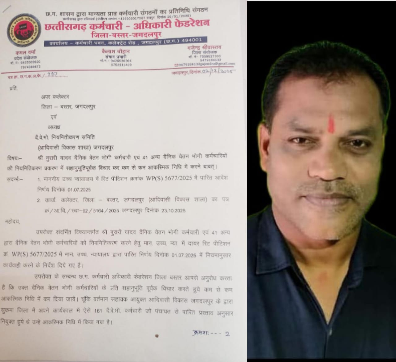 फेडरेशन के जिला संयोजक गजेंद्र श्रीवास्तव ने अपर कलेक्टर एवं अध्यक्ष नियमितीकरण समिति को अवगत कराया की आदिवासी विकास विभाग जगदलपुर में श्री मुरारी यादव दैनिक वेतन भोगी कर्मचारी एवं 41 अन्य द्वारा दैनिक वेतन भोगी कर्मचारियों को नियमितीकरण करने हेतु माननीय उच्च न्यायालय में दायर रिट पिटिशन क्रमांकWP(S) 5677/ 2025 में माननीय उच्च न्यायालय द्वारा पारित निर्णय दिनांक 01.07.2025 में नियमानुसार कार्यवाही करने के निर्देश दिए गए हैं।