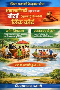 धमतरी…जिले के डुबान प्रभावित दूरस्थ क्षेत्रों के ग्रामीणों को बड़ी राहत देते हुए कलेक्टर श्री अबिनाश मिश्रा ने राजस्व प्रकरणों के त्वरित एवं प्रभावी निराकरण के लिए लिंक कोर्ट सुविधा प्रारंभ करने की घोषणा की थी । यह निर्णय 3 अप्रैल को किए गए क्षेत्रीय दौरे के दौरान ग्राम अकलाडोंगरी में ग्रामीणों से सीधे संवाद के बाद लिया गया।