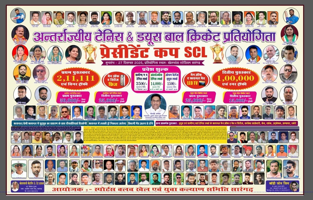 सारंगढ़ प्रेसिडेंट कप SCL में आप सभी का सम्मान अभिवादन है। दिनांक 27 दिसंबर 12:00 बजे शुभारंभ में आप पधार कर खेल खिलाड़ी और खेल भावना को आगे बढ़ते हुए खिलाड़ियों का उत्साहवर्धन करें। सारंगढ़ स्पोर्ट्स क्लब खेल एवं युवा कल्याण समिति के द्वारा निरंतर 21 वर्षों से आयोजित होती आ रही अंतर राज्य स्तरीय टेनिस और न्यूज़ क्रिकेट स्पर्धा जो पूरे जिले की एकमात्र भाव और अत्यधिक राशि की इस स्पर्धा के साथ सारंगढ़ की पहचान बन चुकी है क्रिकेट के खूमार के साथ उक्त आयोजन में आप सभी प्रत्यक्ष एवं अप्रत्यक्ष सहयोगियों का मार्गदर्शन और सहयोग सारंगढ़ के खेल आयोजन के लिए नित्यंत आवश्यक है आदरणीय बहुत ही मुश्किलों से और एक लंबे समय में तैयारी के बाद इस तरह का आयोजन संभव हो पता है और साथ ही इस आयोजन के माध्यम से सारंगढ़ के युवा पीढ़ी का खेल के क्षेत्र में भविष्य भी जुड़ा हुआ है। अतः आपकी उपस्थिति और मार्गदर्शन ही इस आयोजन की निरंतर सफलता का प्रमुख कारण है।