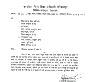 अम्बिकापुर: सरगुजा जिले के सभी सरकारी और निजी स्कूलों के संचालन समय में बड़ा बदलाव किया गया है। जिला शिक्षा अधिकारी (DEO) कार्यालय द्वारा जारी ताजा आदेश के अनुसार, आगामी 11 अप्रैल 2026 से जिले के समस्त शासकीय, अशासकीय और अनुदान प्राप्त विद्यालयों का संचालन सुबह की पाली में किया जाएगा। अब सभी स्कूल पूर्ववत सुबह 7:30 बजे से शुरू होकर दोपहर 11:30 बजे तक संचालित होंगे।