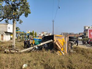 अनियंत्रित ट्रेलर,ट्रांसफार्मर और स्ट्रीट लाइट को ठोकर मारते हुए पलटी बाल बाल बचा चालक।