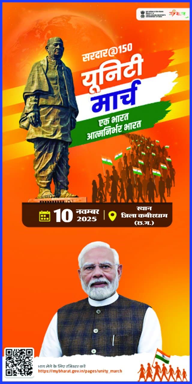 कवर्धा में यूनिटीमार्च का आयोजन कल, प्रभारी मंत्री, सांसद अन्य जनप्रतिनिधिगण सहित बड़ी संख्या में लोग होंगे शामिल। सरदार वल्लभभाई पटेल की जयंती के उपलक्ष्य में होगा आयोजन।