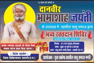 नगरी: दानवीर भामाशाह जयंती के अवसर पर युवा प्रकोष्ठ तहसील साहू समाज नगरी सिहावा के द्वारा 21 अप्रैल मंगलवार को साहू सदन नगरी में भव्य रक्त दान शिविर का आयोजन किया गया है। शिविर में मुख्य रूप से जिला चिकित्सालय धमतरी एवं सीएचसी नगरी के चिकित्सा कर्मी उपस्थित रहेंगे। एवं प्रत्येक रक्त दाताओं को विशेष गिफ्ट सम्मान स्वरूप प्रदान किया जाएगा।